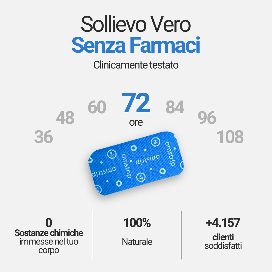 - Omstrip Wellness: stimulates so-called "therapeutic" biofrequencies. Stimulating these biofrequencies significantly reduces the perception of pain (VAS scale) and accelerates the recovery period.